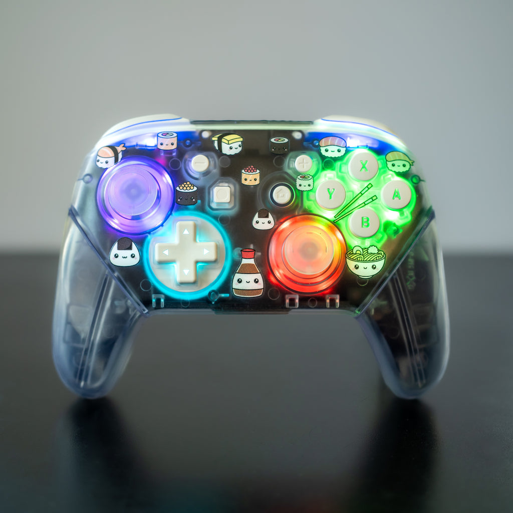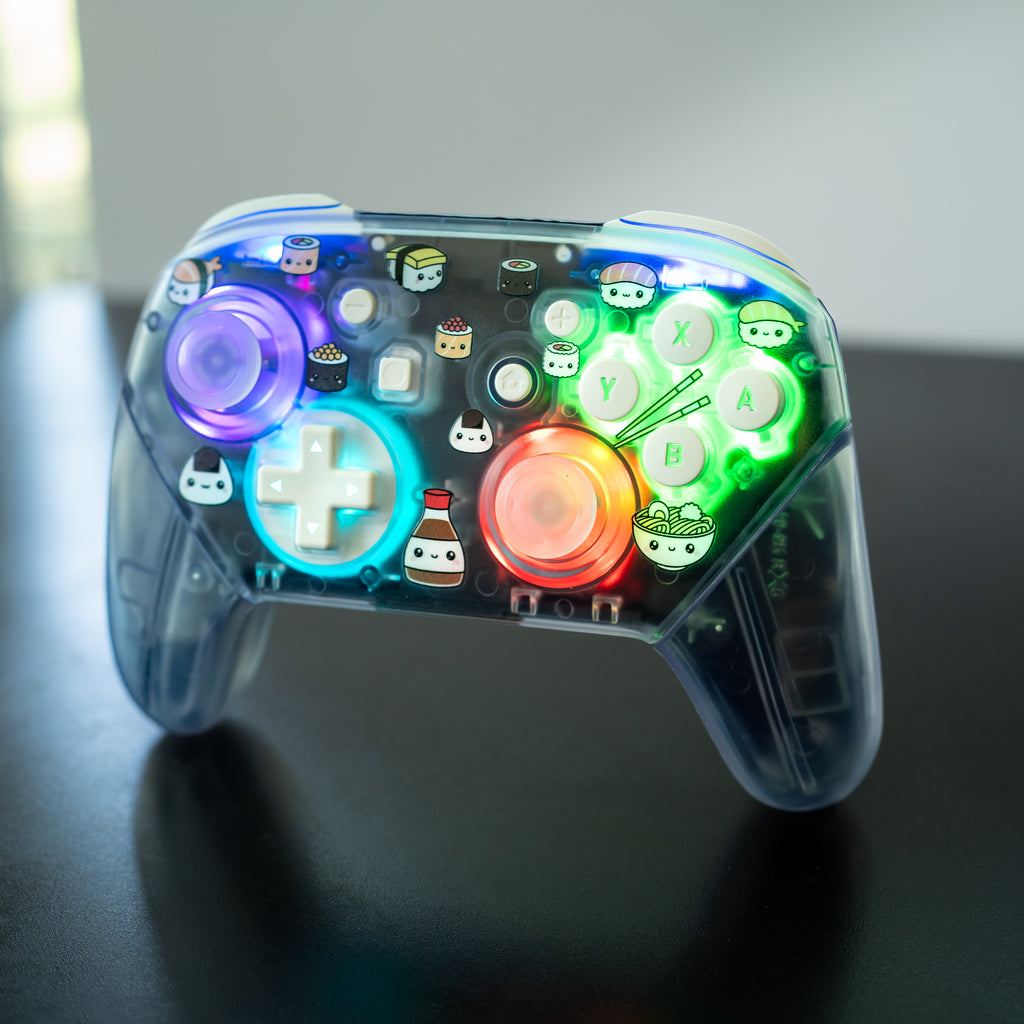 This custom Nintendo Switch Pro Controller is a feast for the eyes! Featuring a clear shell that lets you see the inner workings and a vibrant LED backlight for the buttons, this controller is designed to stand out. The premium, high-quality UV-printed design showcases a variety of adorable sushi types, adding a unique and playful touch to your gaming setup.