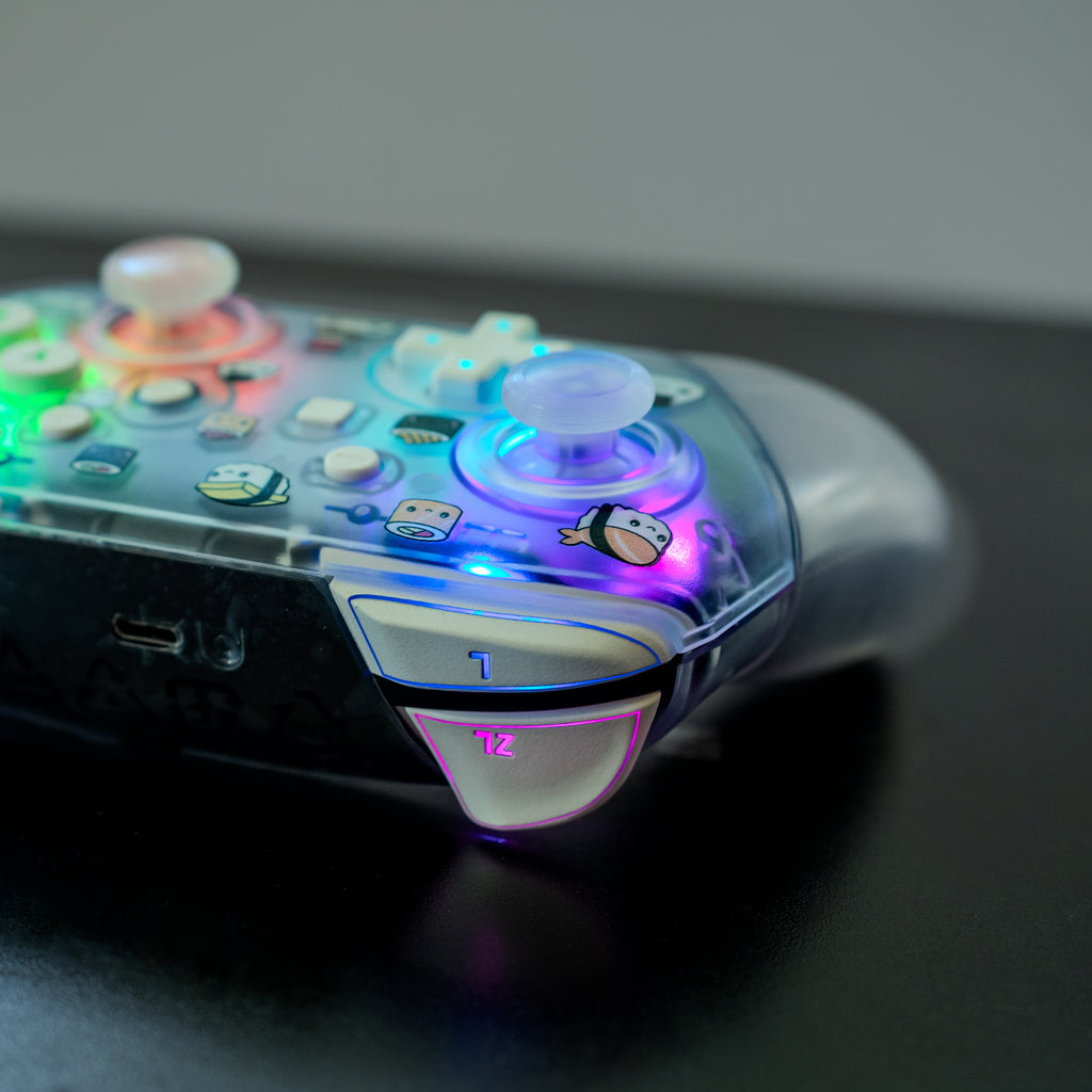 UV-printed sushi artwork. - Clear Shell: A transparent design that showcases the controller's internal