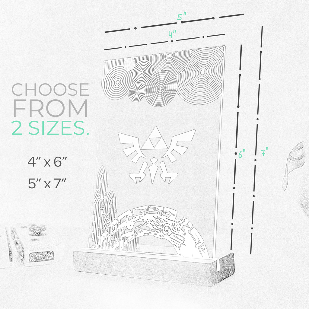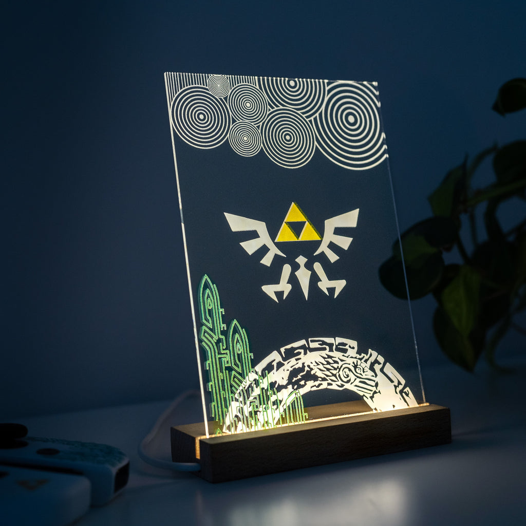 This beautiful LED decoration is made with a meticulously printed acrylic plate, adorned with everything necessary for an adventure in the Kingdom Of Hyrule and sits on a wooden base. Just dim the lights in your room, and light it up.