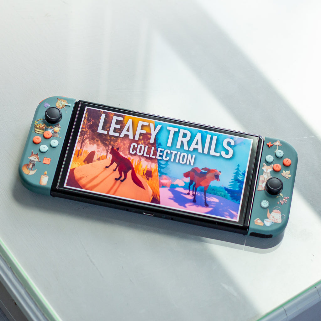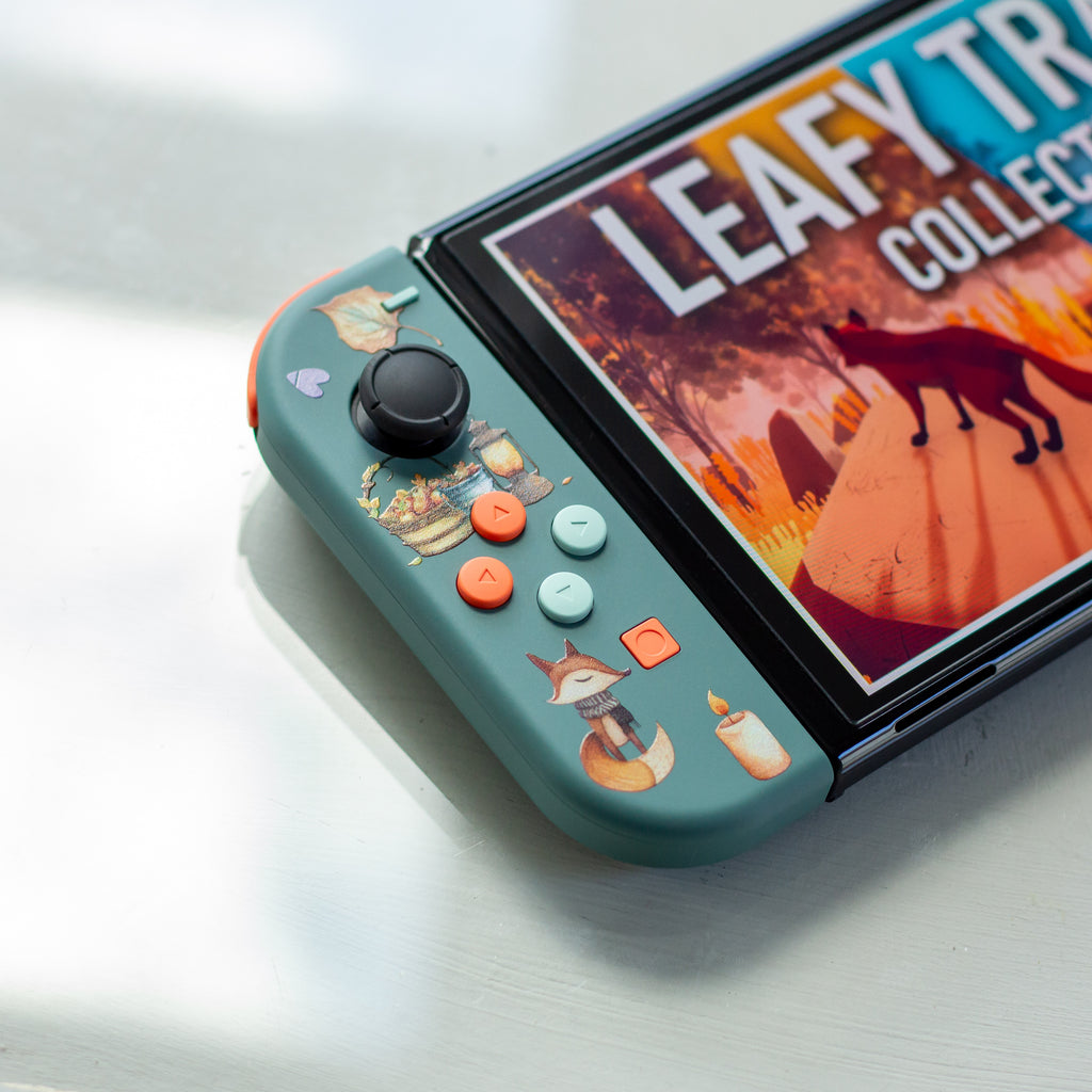 Featuring pine-colored shells, an autumn-themed design, and teal and coral buttons, they will transform your Switch into a beautiful console, in handheld gaming or docked.