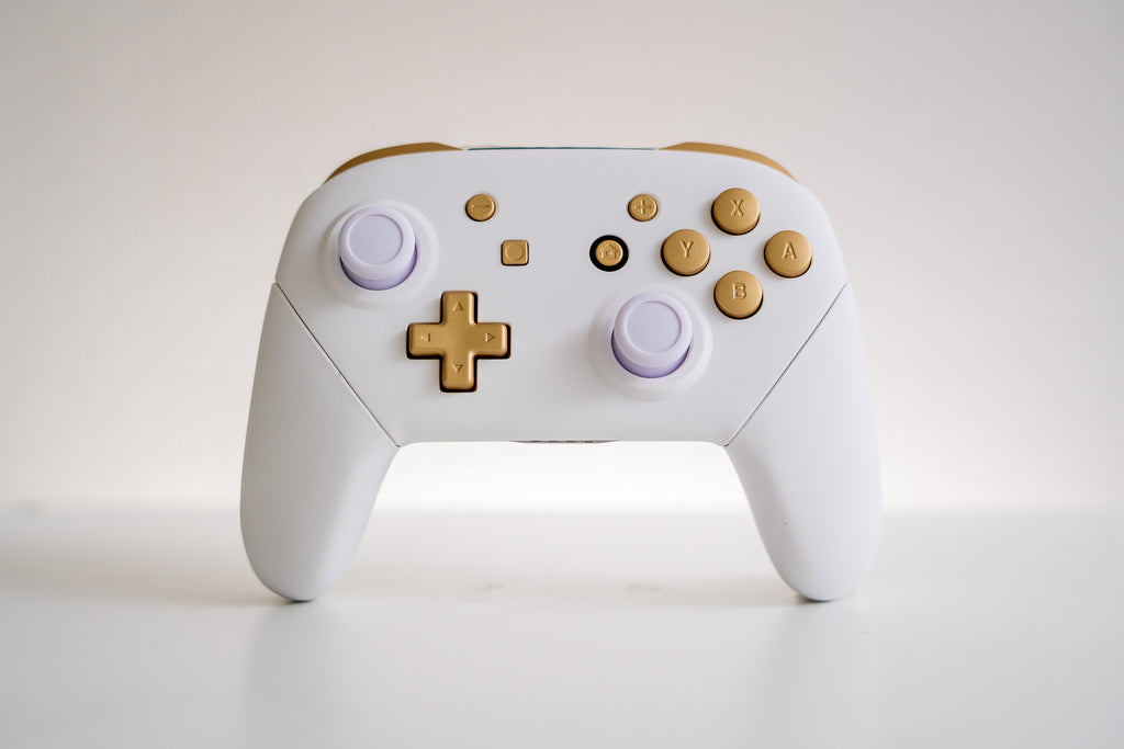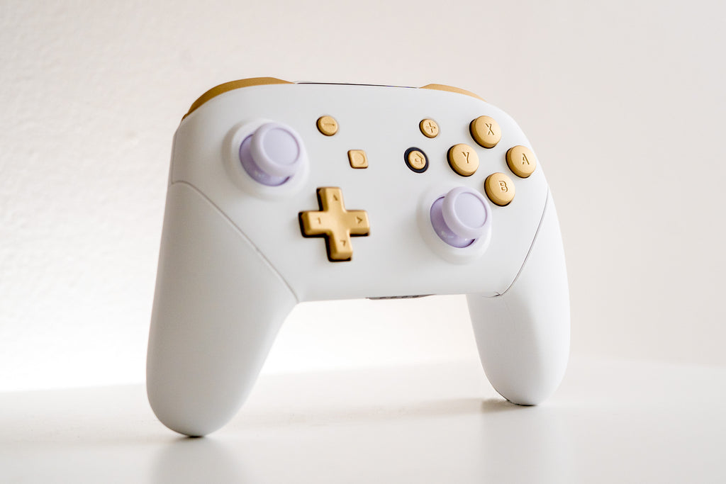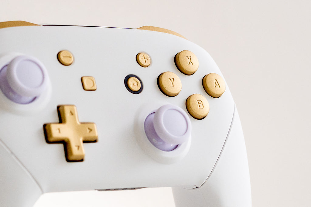 New Summer 2023 design! Exquisite and refined, this white Pro-Controller mod with brushed gold buttons is one of the most distinguished customizations we've built in our shop. The clean, white aesthetic paired with matte brushed gold buttons creates a stunning contrast, elevating its sophistication. This subtle change, though minimal, takes the elegance of this controller mod to an entirely new level. Whether in your hands or resting on a coffee table, this mod is not just a visual delight but also enhances your gaming comfort and abilities.