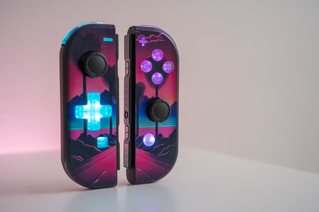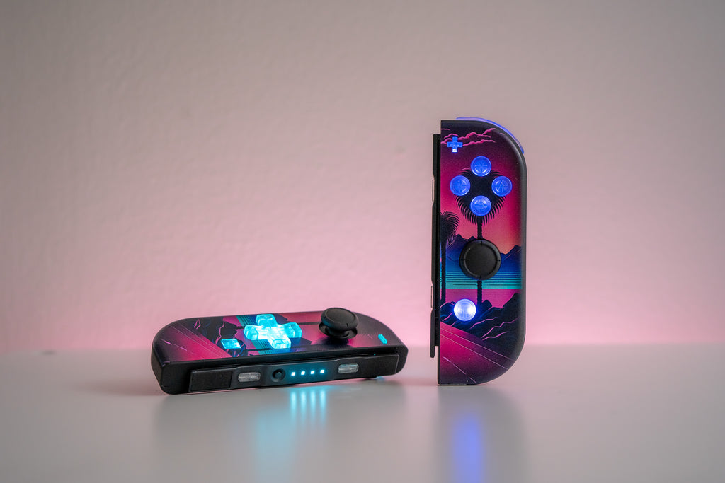 Transform your Switch gaming experience into a neon-soaked universe of the future 80s with our new Synthwave LED backlit modded Joy-Cons.