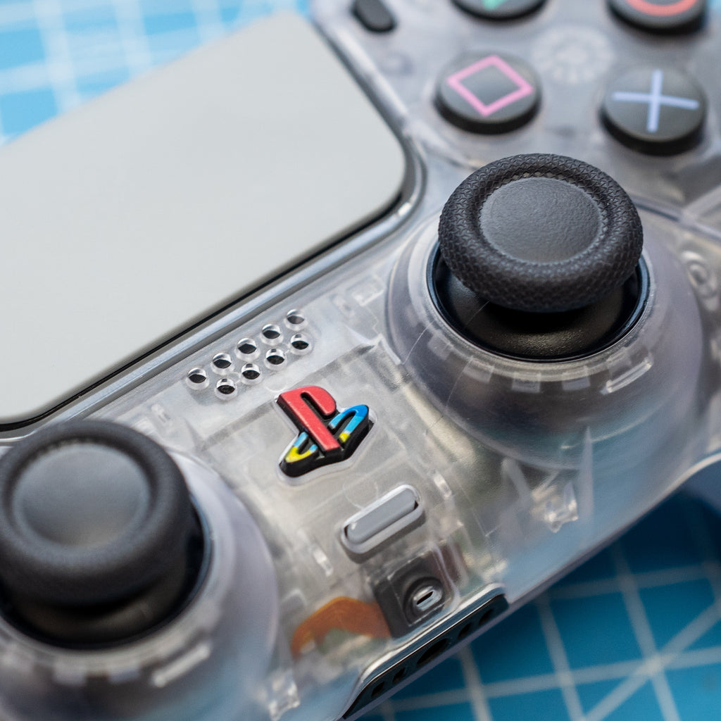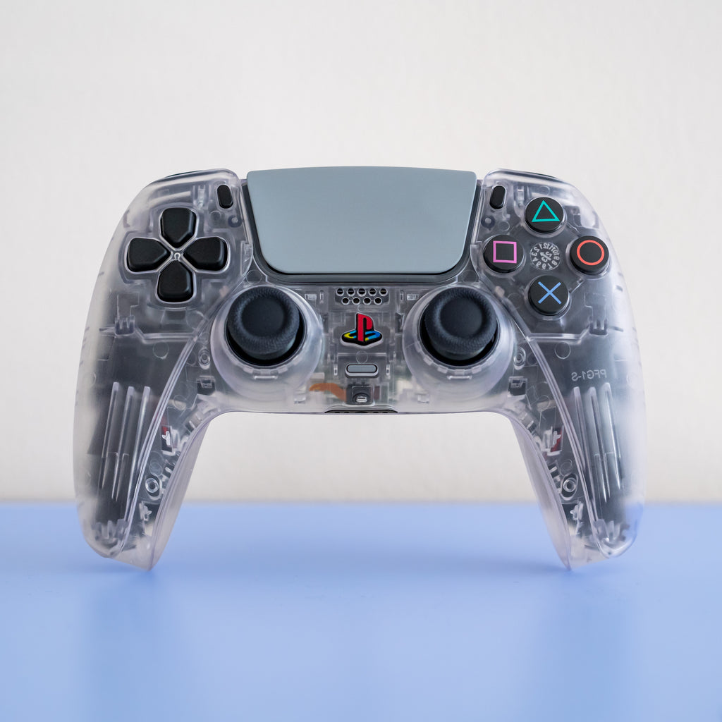 The clear shells are fitted with retro action buttons, a colorful PS button, and a grey touchpad. All are our tribute to the iconic PS1 and PS3 controllers.