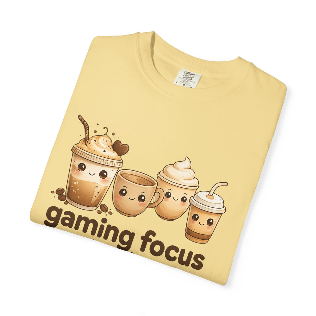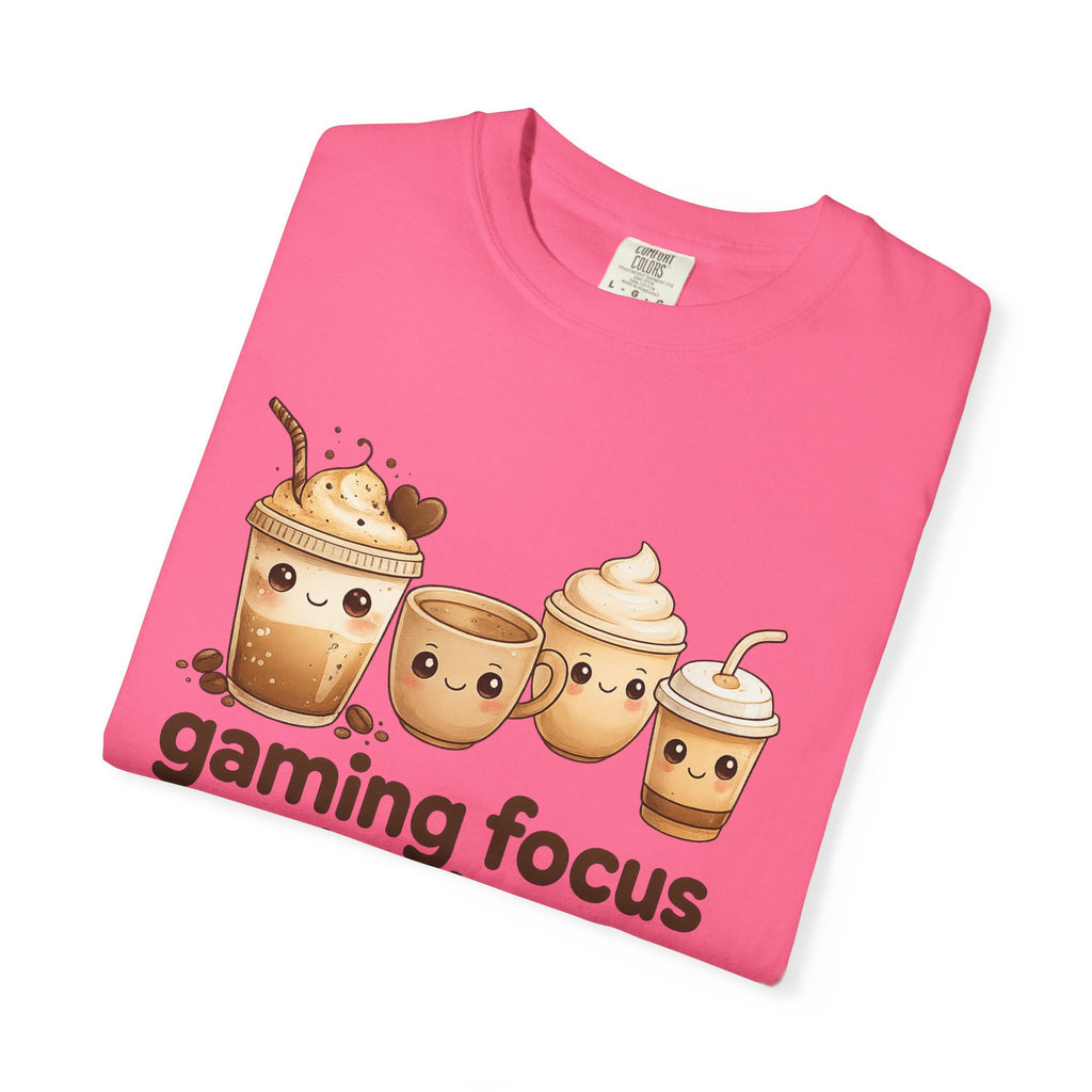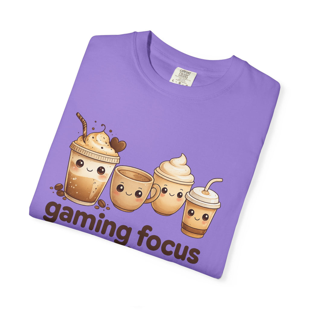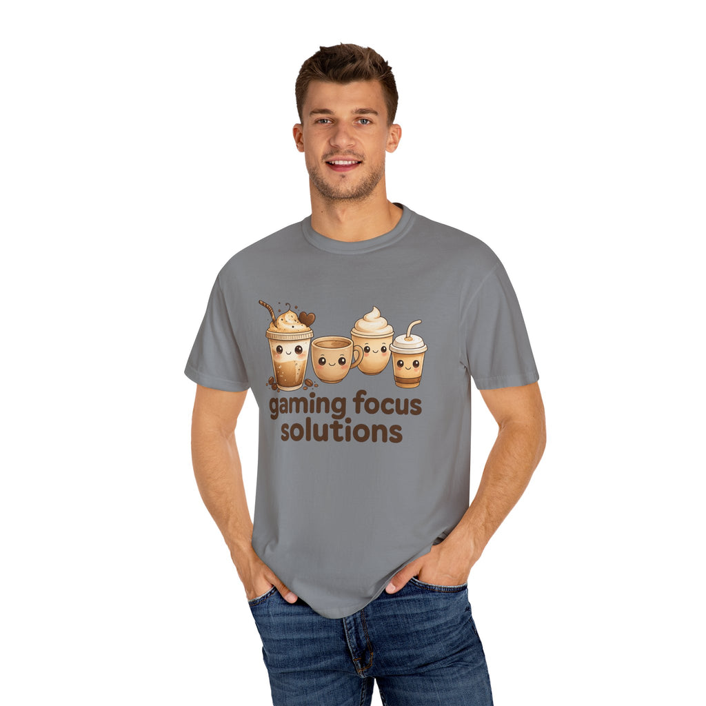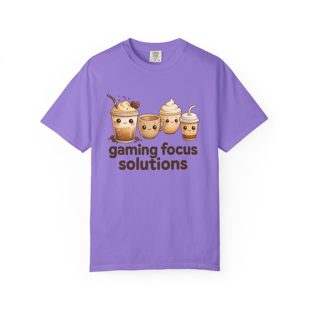 Underneath, the phrase "gaming focus solutions" isn't just text; it's a testament to how these beloved beverages sharpen our minds, keeping us in the zone for those critical in-game decisions. This tee is for every gamer who knows the power of a good brew, every coffee lover who understands the thrill of the game, and anyone who simply can't resist a touch of undeniable cuteness.