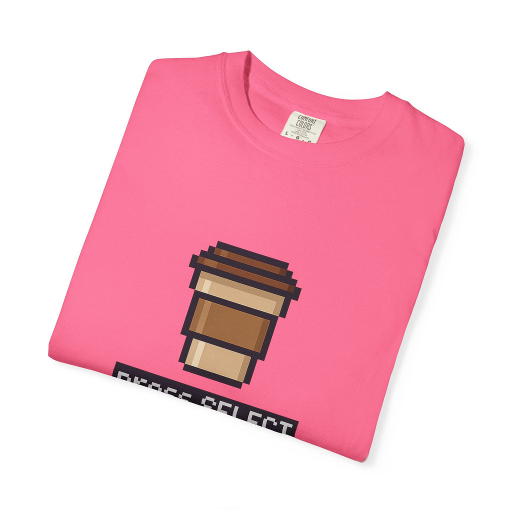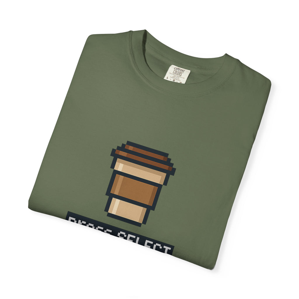 Our exclusive "Press SELECT to Pick Up Item" 8-bit pixelated coffee cup tee is a nostalgic nod to those classic gaming moments, blended perfectly with your love for a good brew. Featuring a charmingly retro pixel art coffee cup and the iconic "Press SELECT to pick up item" prompt, this shirt speaks directly to the gamer in all of us who knows the importance of a well-equipped inventory—especially when that inventory includes coffee!