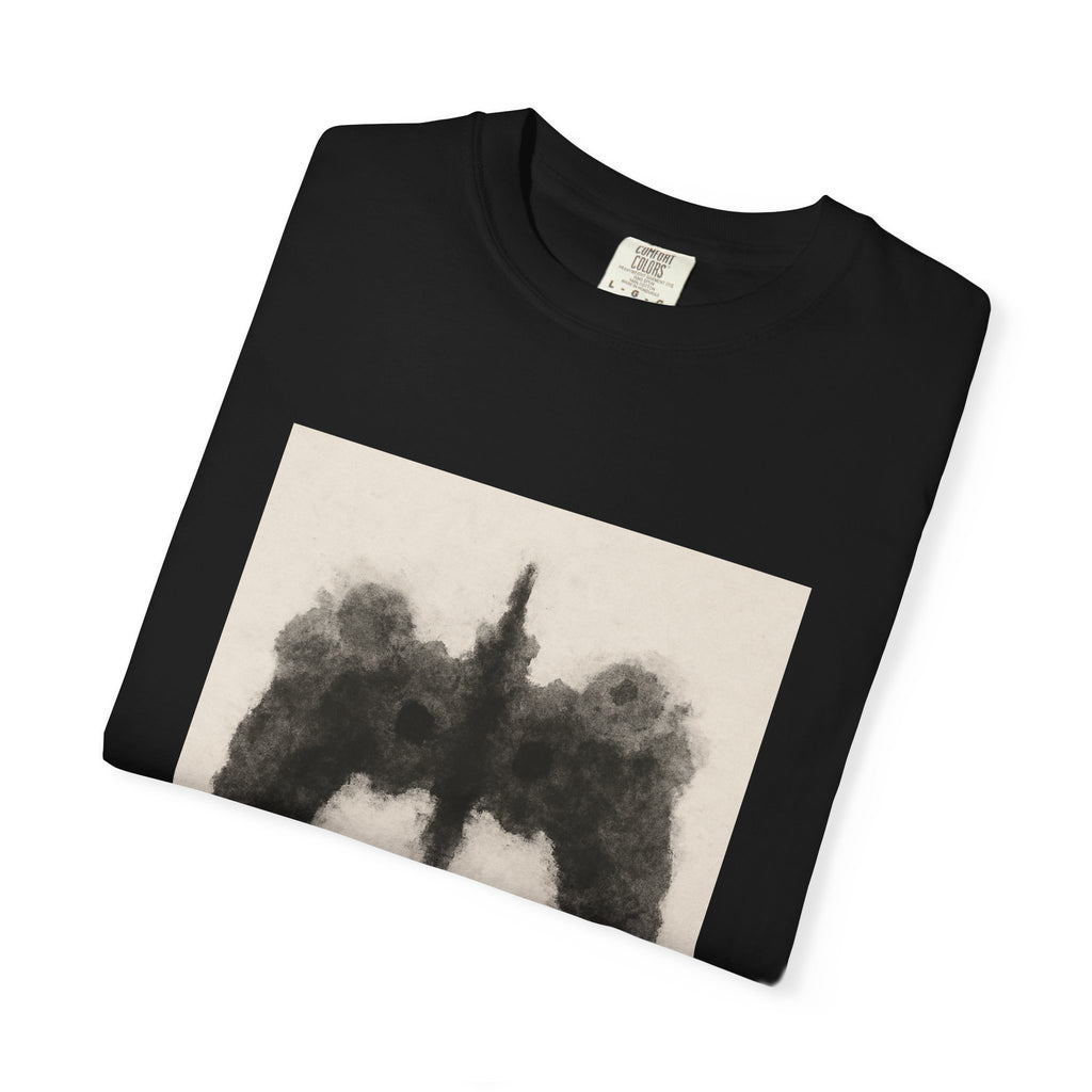 What do you see? At first glance, it's a classic Rorschach inkblot, but for those in the know, it's a perfectly symmetrical, abstract representation of a video game controller. Our "Rorschach Gamer" tee is a clever and subtle nod to the gaming world, blending high-brow psychology with low-key gamer culture.
