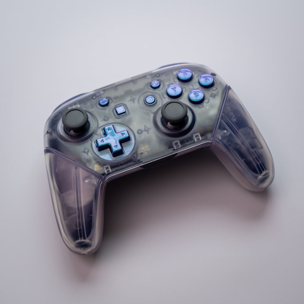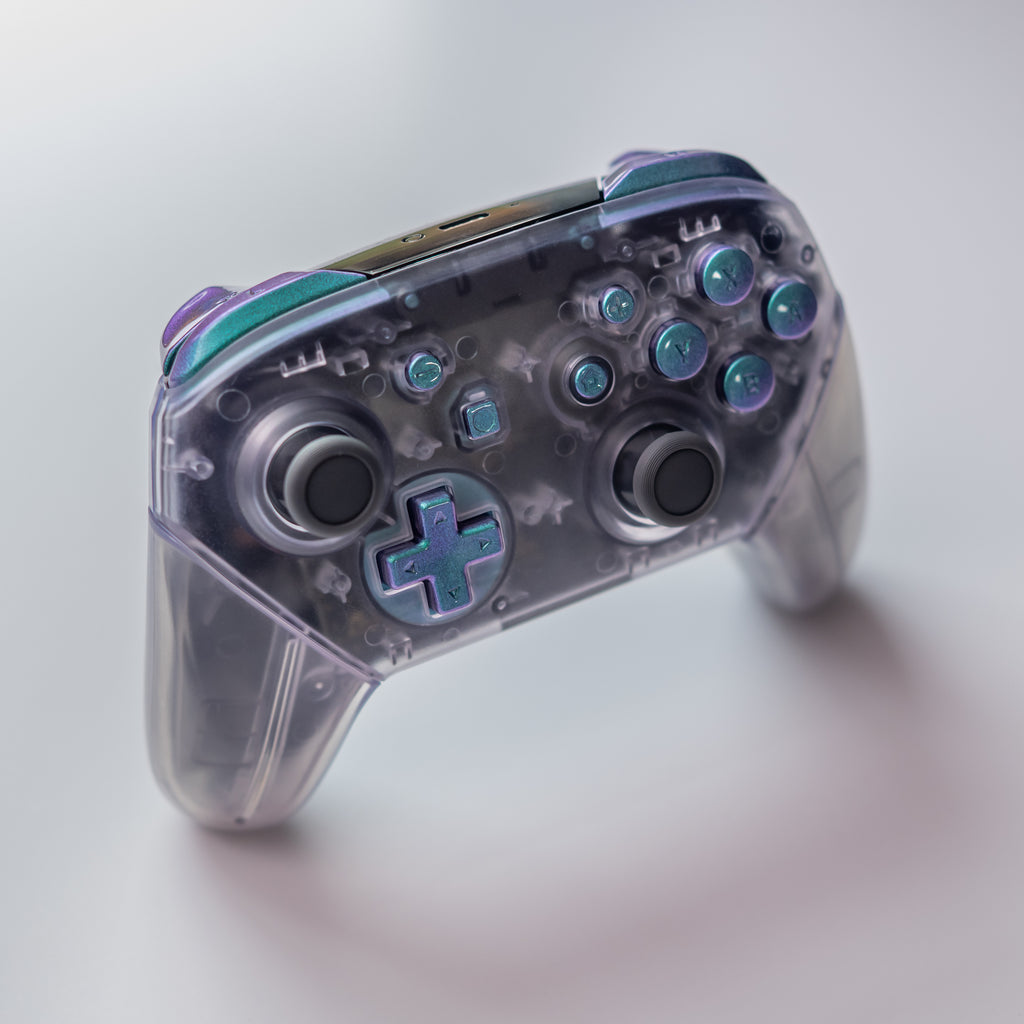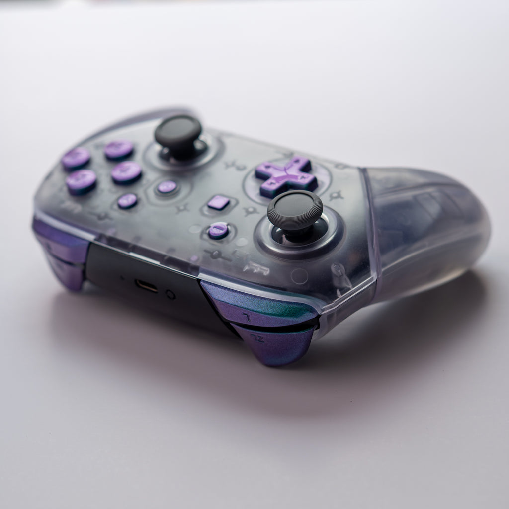 Nintendo Switch “Purple Reign” Pro-Controller Custom Clear Shells With Iridescent Purple And Blue Buttons