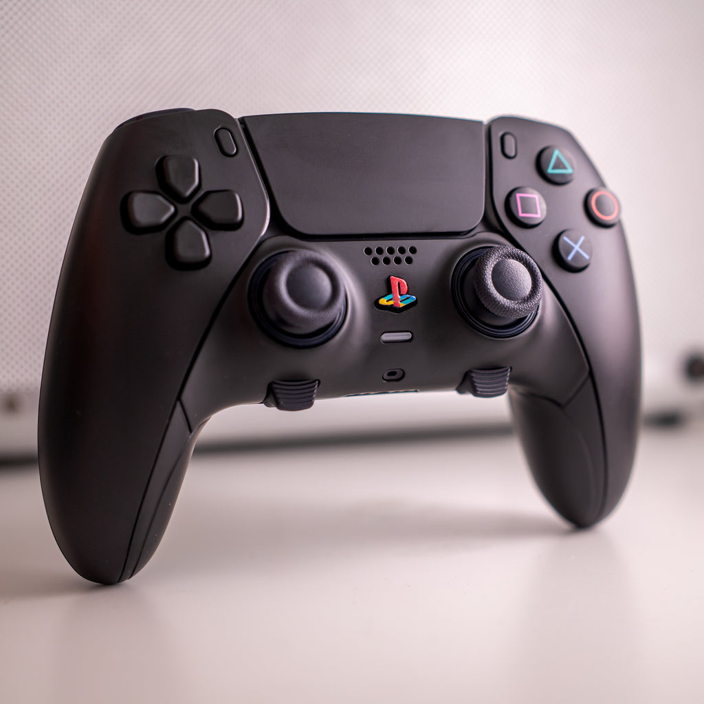 Our retro black mono PS5 Edge controller has a nostalgic stealthy customization aesthetic that maintains all the advanced customizable features of the Edge, while evoking 30 years of PlayStation legacy and iconic design.