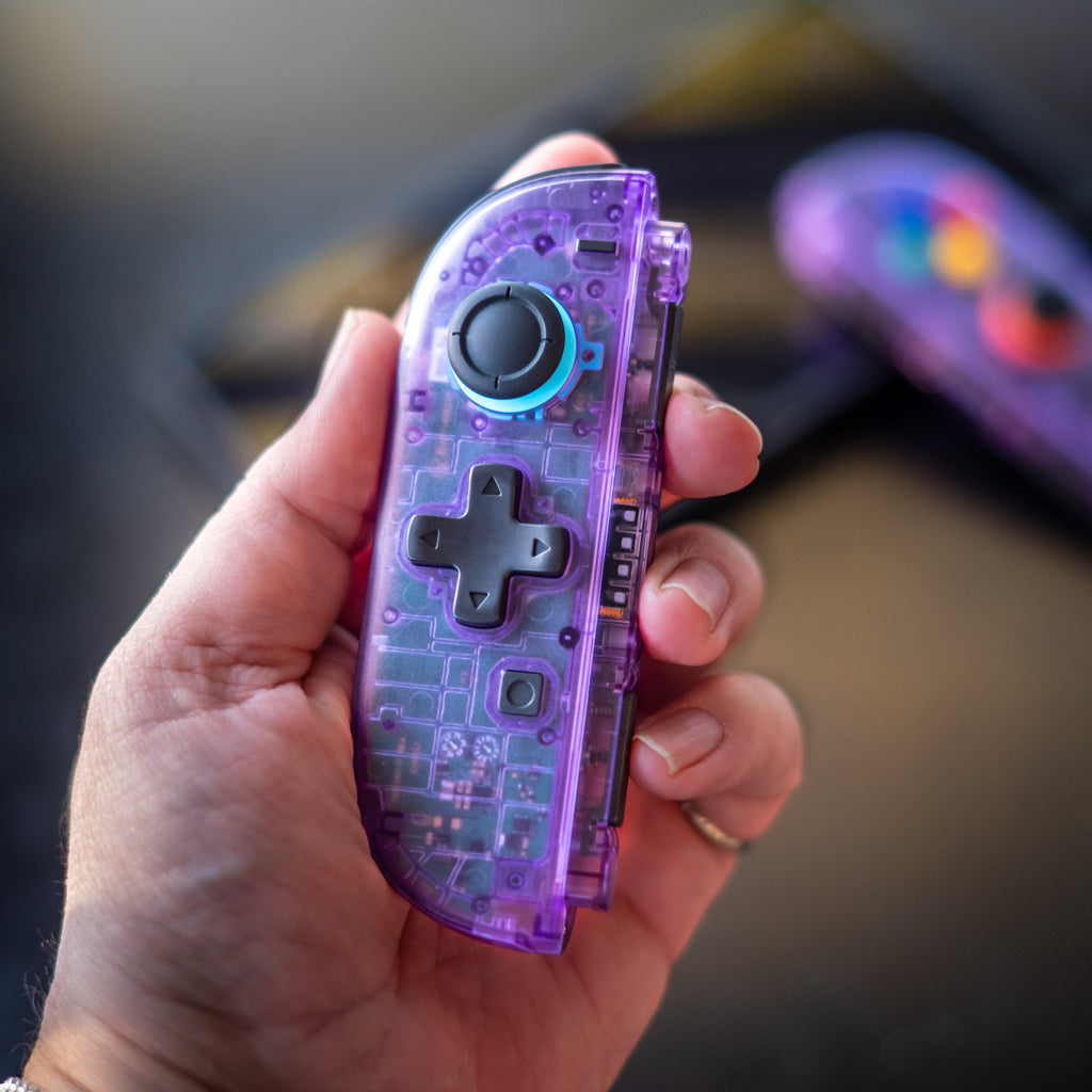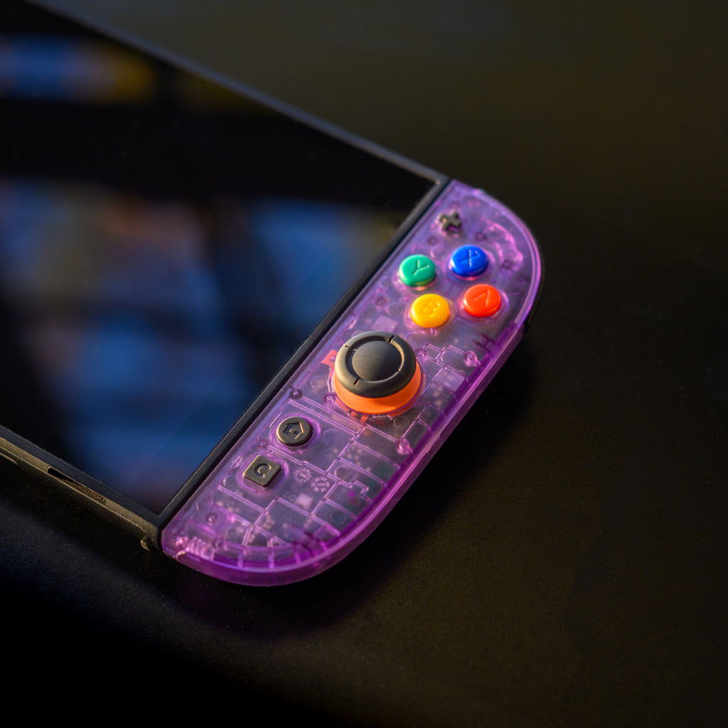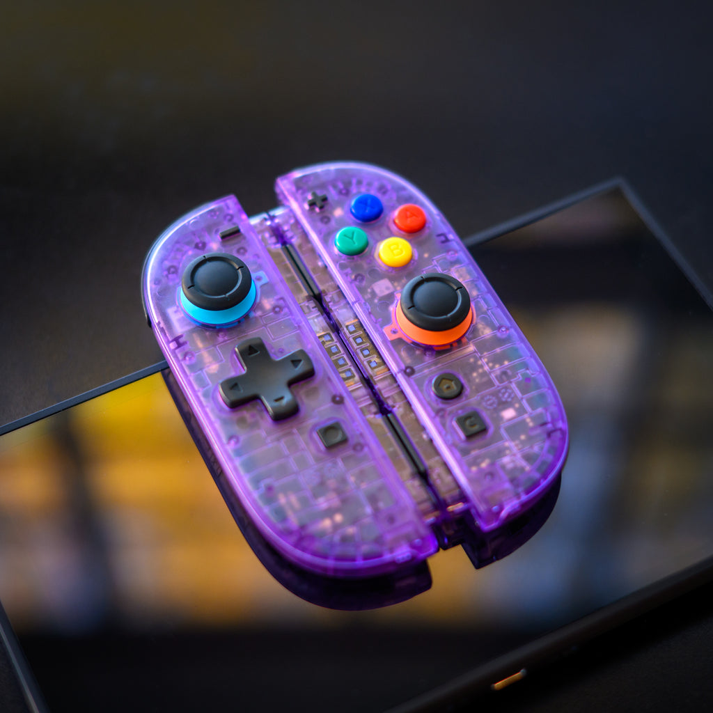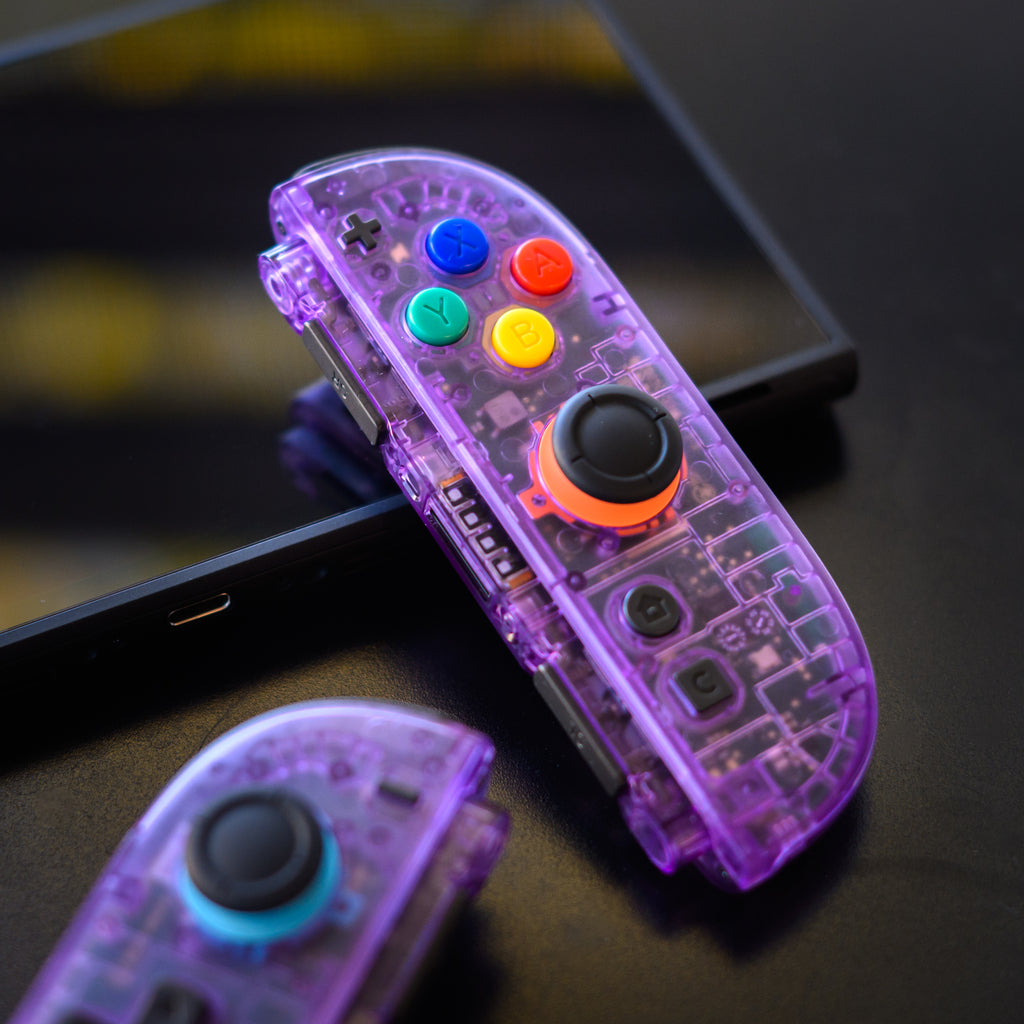 Our premium, hand-assembled Joy-Con 2s feature clear Atomic Purple shells, the quintessential transparent look reminiscent of the beloved Nintendo 64 and Game Boy Color era. This iconic casing perfectly showcases the controllers' intricate internal components, giving your Switch 2 a truly unique, head-turning style that celebrates its lineage.
