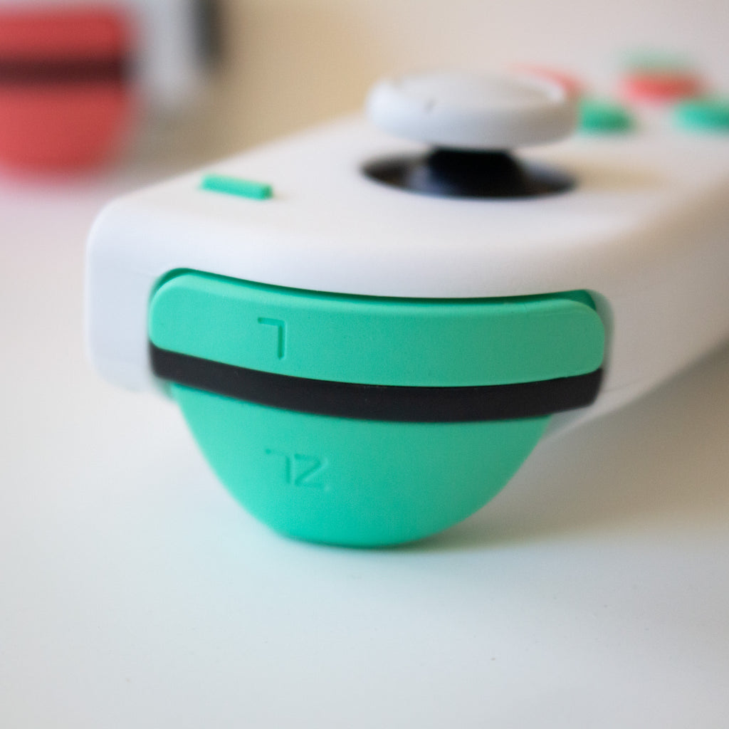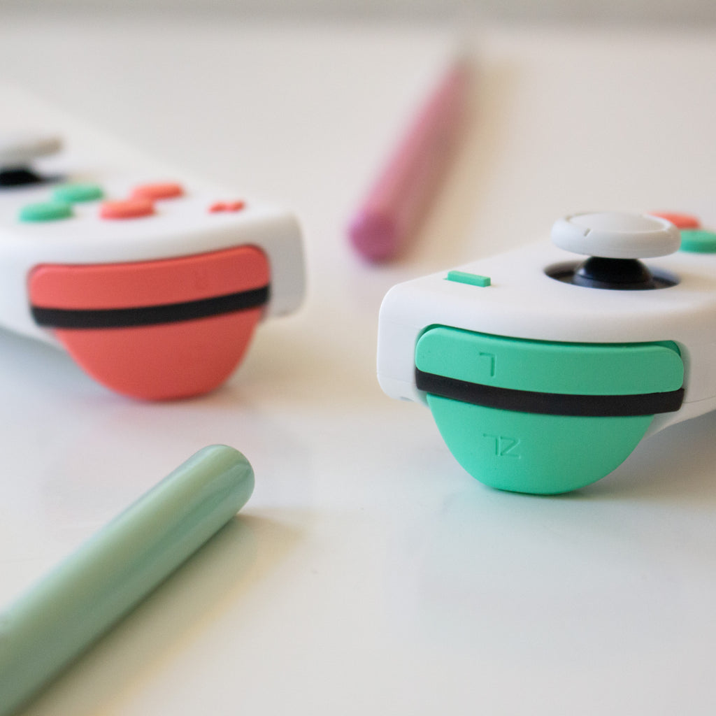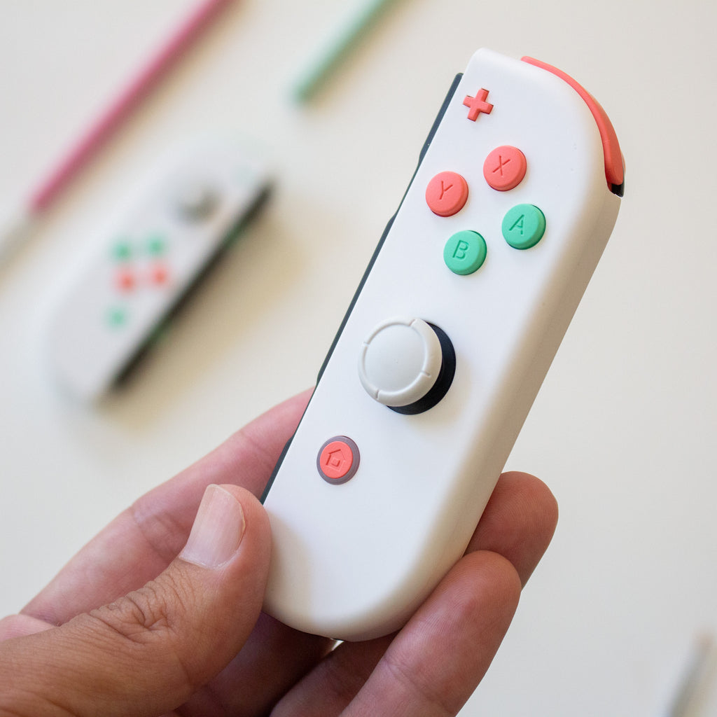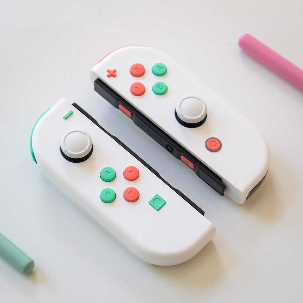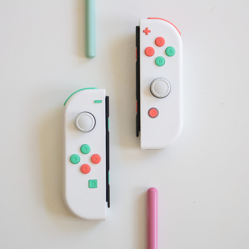 This set of customized Joy-Cons feature sleek clicky pastel colored buttons in Mint and Coral pink with White analog sticks, custom-made for your pastel gaming experience and fresh gaming passion.