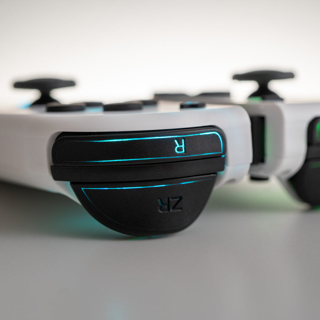 The LEDs breath life into this white elegant set, making it look unreal in your hands or docked in your gaming setup. The black buttons allow the LEDs to light up only the shape of the button symbols, which gives these Joy-Cons a more refined look.
